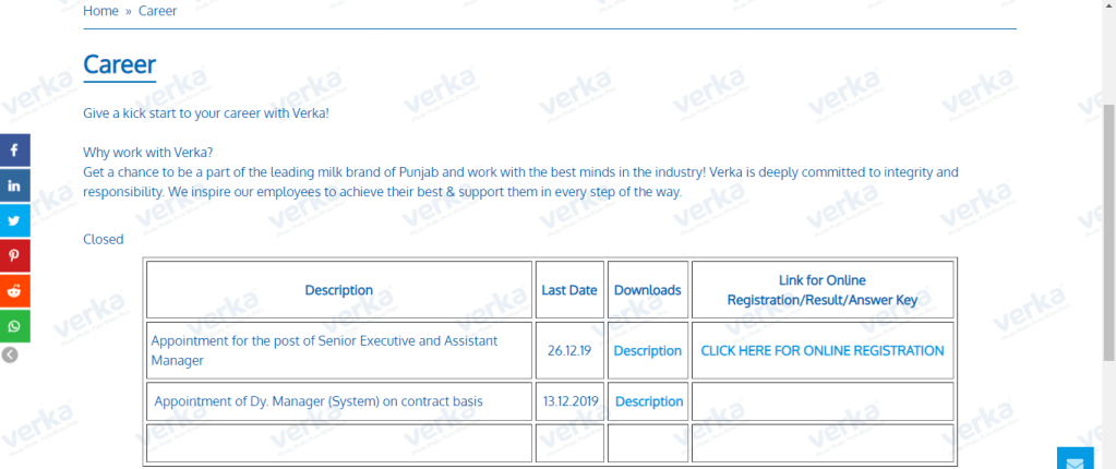 आप हमारी वेबसाइट से सीधे भी आवेदन कर सकते है इसके लिए दिए गए लिकं पर क्लिक करे | http://www.verka.coop/page/career